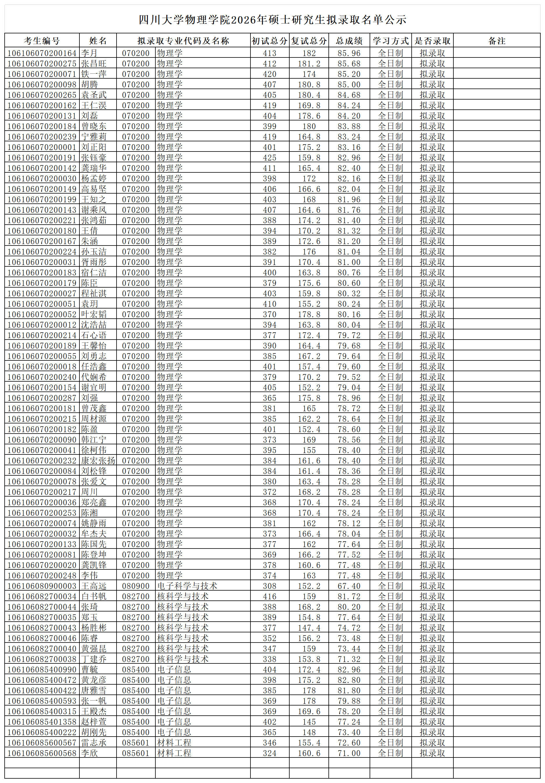 四川大学物理学院2026年硕士研究生拟录取名单公示