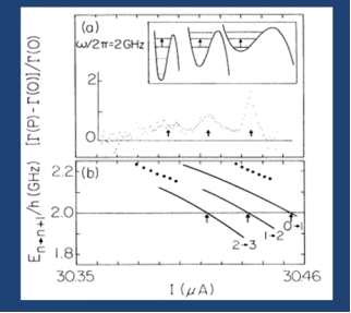 图4 在固定频率的微波照射下,结的逃逸速率在三个特定偏置电流处出现共振峰,表明存在分立的能级跃迁。这些能级的位置与量子力学计算结果高度相符。
