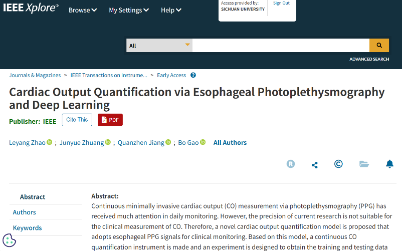 近日,依托学校2024/2025年度大学生创新训练计划项目,以2022级赵乐阳、2021级庄俊月及2022级姜权真等本科生为核心的研究团队,在物理学院高博副教授指导下,在仪器测量领域权威期刊《IEEE Transactions on Instrumentation and Measurement》发表题为《Cardiac Output Quantification via Esophageal Photoplethysmography and Deep Learning》的学术论文。