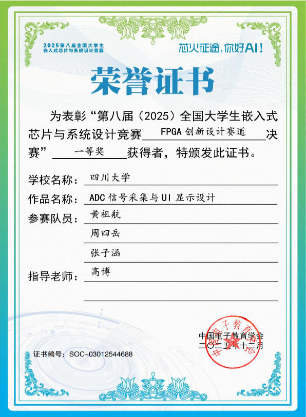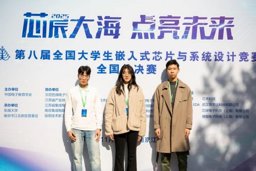 近日,第八届(2025)全国大学生嵌入式芯片与系统设计竞赛 FPGA 创新设计赛道全国总决赛在南京圆满落幕。本届赛事共吸引全国 342所院校3901支队伍、超万名学子同台竞技,决赛通过率仅15%,竞争异常激烈。学院2023级本科生团队,黄祖航、周四岳、张子涵,由高博老师指导,凭借扎实的专业功底与创新实践能力脱颖而出,斩获全国一等奖1项。